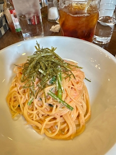 本日のパスタ何か聞くの忘れて明太子のパスタやった🍝 あんまり好きじゃないけど完食した笑 おなかパンパン😇