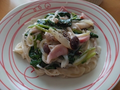〜クリームパスタ風〜スパゲッティの麺がなかったので、余っていた素麺で代用しました😊具玉ねぎ🧅、しめじ、ほうれん草、ベーコン 〜デザート①〜柿🍊良い感じに熟していたので、とても柔らかく、甘かったです😊〜デザート②〜プリンを作りました🍮