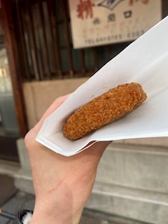 皆様お疲れ様です✨ お肉屋さんのコロッケって美味しいですよね✨ ひとつ100円✨ ラードの油で揚げた独特の風味でほんのり甘くて揚げたてを食べるのは美味しかったですよ✨ 大阪の魅力はまさに人と言えますが、その際たるものが商店街に詰まっているきがします✨ たくさんの商店街があり賑わってるみたいですからひとつずつ制覇しようと思っていて中々行けてなかったなと思い出しました笑
