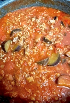 おひるごはーん お野菜とりたいからポトフにしようかとも思ったけどミートソース🍝が無性に食べたい!ってなって 材料買って いざ料理冷蔵庫になす🍆とトマト🍅もあったからなすとフレッシュトマトのミートソース🍝もちろん 醤油麹も入れました🎶