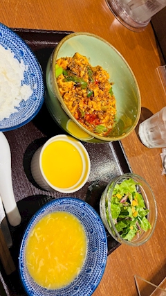 なぎさちゃんとランチ😀 鉄板のオムライス食べに行く予定が 満席で むかいのお店の麻婆豆腐を食べました 女子会とかいうかわいいものでは もうなくなり カウンターでふたりで麻婆豆腐食べるふたり😂 今度はかわいいランチ会したいと思います🥰