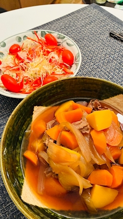 地元のお友達が野菜たくさん送ってくれて🙂カレーと肉じゃが作りました あまいニンジンとインカのじゃがいもだったからもったいないかなーと思いつつカレーと肉じゃが😅ニンジンポタージュ🥕とかにすれば良かったと思いました😂パプリカの使い方レパートリーがなくてサラダ🥗に赤いなぁ…自分のご飯だからいいか😂これで2日は作らなくていい👌