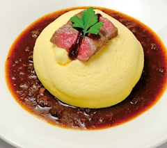 街中で見かけたステーキハウスの看板のオムライスが🍅🍳🍚 スフレ状のふわふわたまごに牛フィレ肉のトッピング🐄⸒⸒ オムライスにしては高値やけど恐る恐る食べてみたい🫠