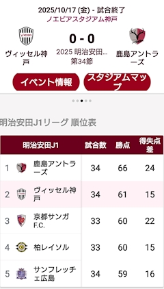 スコアレスドローで終了🫨シュート数、ボール支配率はヴッセルが上やっただけに残念でならない😨 アウェイ側から(一応ホーム席)ゴール裏を観るのも楽し⚽