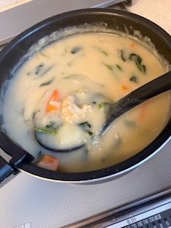 本日の一品▶︎ クリームシチュー❤︎ ✳︎さんむい今日にぴったりですな🥹シチューはブロッコリー🥦使うコトが多いけど・今日は気分でほうれん草でみどりをぷらす♡