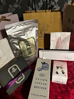 何かたくさんいただいて😳 申し訳ないと共にほんまにありがとう♥️ 休憩時間の☕️おやつタイムに全部開けてみたけど😁 宝石箱やぁ〜💎🤩 八女茶🍵と共に🍫1つずつあとはひとくちずつかじって😅 また明日も明後日もちびちび食べるよ😂 確実に全部美味しい🥰 ちょっと困ったけども美味しすぎて 嬉しいわ🥰 感謝でしかないよ🙏 おやすみなさい…。