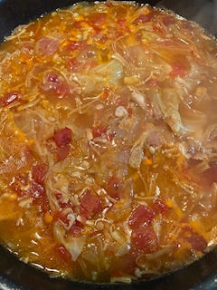 只今煮込み中のスープ✨ 美味しくなぁ〜れぇ〜 美味しくなぁ〜れぇ〜 美味しくなぁ〜れぇ〜 魔女🧙♀️レベルでおまじない🪄🤣 鶏もも肉とエノキとキャベツだけのスープ 🧄🫚少し🤏入れて煮込むだけ トマト🍅とコンソメと塩胡椒で整える 寒いからね🥶 あとはガーリックトーストを添えたら ガッツリ食べるだけ😋😋😋
