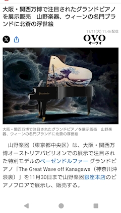 なんか急に仕事が落ち着いてきました😅 今日だけかな。。 油断してると、また一気に仕事に押しつぶされるので、しっかりやることは終わらせます☝️ 大阪関西万博のオーストリアパビリオンに展示されていたピアノ🎹 入ってすぐに置かれてて、自動演奏機能があって素敵な音を奏でてましたが、、 あれって、販売されるんですね💦💦 ベーゼンドルファーのピアノに葛飾北斎の絵だそうで。。 贅沢〜✨✨ こんなのが家にあったら、博物館ですね😄 普通に弾けなさそう。。 価格は4,994万円だそうです。 誰かが買うのでしょうか。。 では、これから出勤します。 準備しまーす。