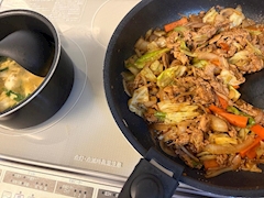 本日の夕食▶︎ ⚫︎ 味噌炒め⚫︎ ニラ玉すーぷ⚫︎ 炊き立てごはん🍚