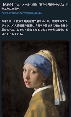 おはようございます😊 昨夜お友達からのLINEでヤバーー!📱 って届いた😳 フェルメールの真珠の耳飾りの少女🖼️ 今回で見納め〜😱 ラピスラズリのフェルメールブルー🩵ばっかり言われてるけど😅 やっぱり私は昔から真珠の白🤍っの色味が気になる😄 もう最後になるのなら見に行かないと🖼️😄