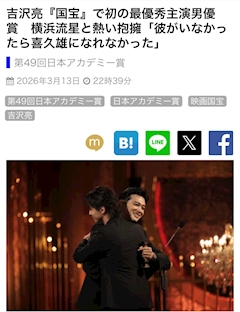 おはようございます😊 昨夜はアカデミー賞🏆授賞式を見てました📺 主演女優賞の倍賞千恵子さんTOKYOタクシー🚕昨日観たとこだから私の中では旬で何か嬉しかったなぁ☺️ もちろん国宝は全部持っていくだろうと誰もが予想してたけど確かに国宝10冠🏆凄かった👏😆 国宝観に行った時次の最優秀主演男優賞は吉沢亮!って他の映画も観てないのに😜勝手にお友達とそんなお話で盛り上がったりしたけれど😅 ちゃんと持っていきましたやーん🏆👏😆 いつ見てもなんて2次元な 美しいお顔🤩 ちゃんと毛穴あって人間でしたわ🤣 授賞されていくのを見てた中で📺ナイトフラワー見てみたいってなったなぁ😃 日本アカデミー賞🏆感動しました🥺