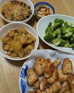 おひるごはーん 和食は茶色ばかりで📸映えないなぁ〜◯チキンカツ(鶏むね肉)◯大根の煮物◯中華春雨辛口◯茹でブロッコリー