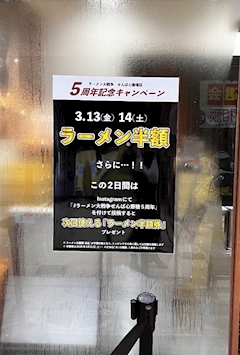 おはようございます🌤️ 「ラーメン半額」の文字を発見👀❣️ どうやら ラーメン大戦争せんば心斎橋店の 5周年記念キャンペーンみたいです🍜 3月13日・14日の2日間はラーメンが半額🍜 さらにInstagram 投稿で、次回使える半額券ももらえるそう🎫 ラーメン好きには嬉しいイベントですね! タイミングが合えば行ってみたいなぁ〜😻