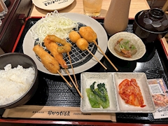 午前の美容終わってお昼ご飯🍚 京都駅はどのお店も並んでて唯一 串カツだるまだけガラガラで入店😊大阪のだるまは並んでるのに😅 ランチがあるって知らなかった😅 生麩の串カツは京都店限定だったので注文しました😊